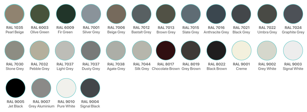 Discover our selection of standard RAL colours below, each available in your choice of matt or gloss finishes, with gloss levels of 30 and 77. Colours not listed are classified as special orders. Choose the perfect hue to complement your home's style.